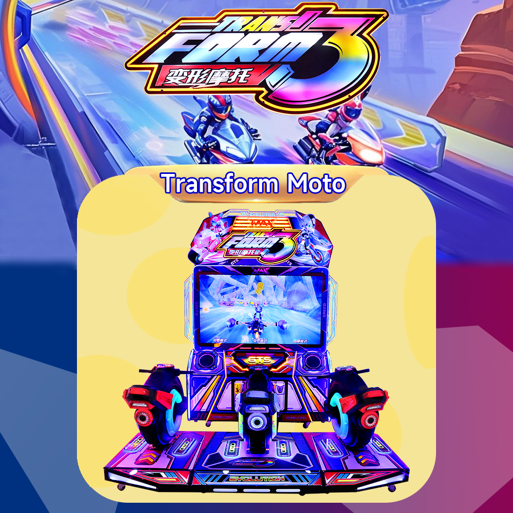 The arcade machine for sale features a sturdy transformable motorcycle cabinet designed for durability and visual appeal. Rigorously tested for indoor entertainment settings, materials are selected to withstand frequent use while maintaining reliable operation. This ensures a long-lasting arcade motorcycle game experience suitable for family centers and arcades.