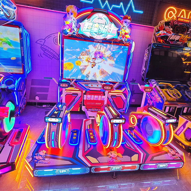 ★ Product Features ★ 1. Dynamic riding experience: Adopting a bicycle racing mode, it brings immersive riding pleasure through real pedal control 2. Multiplayer competitive interaction: Supports three people to participate simultaneously, allowing for both team collaboration and competition on the same stage 3. Panoramic visual feast: The large LCD screen presents five different themed racing scenes 4. Combining health and entertainment: perfectly integrating sports and fitness with electronic games 5. Safe and comfortable design: Stable body structure paired with ergonomic riding seats