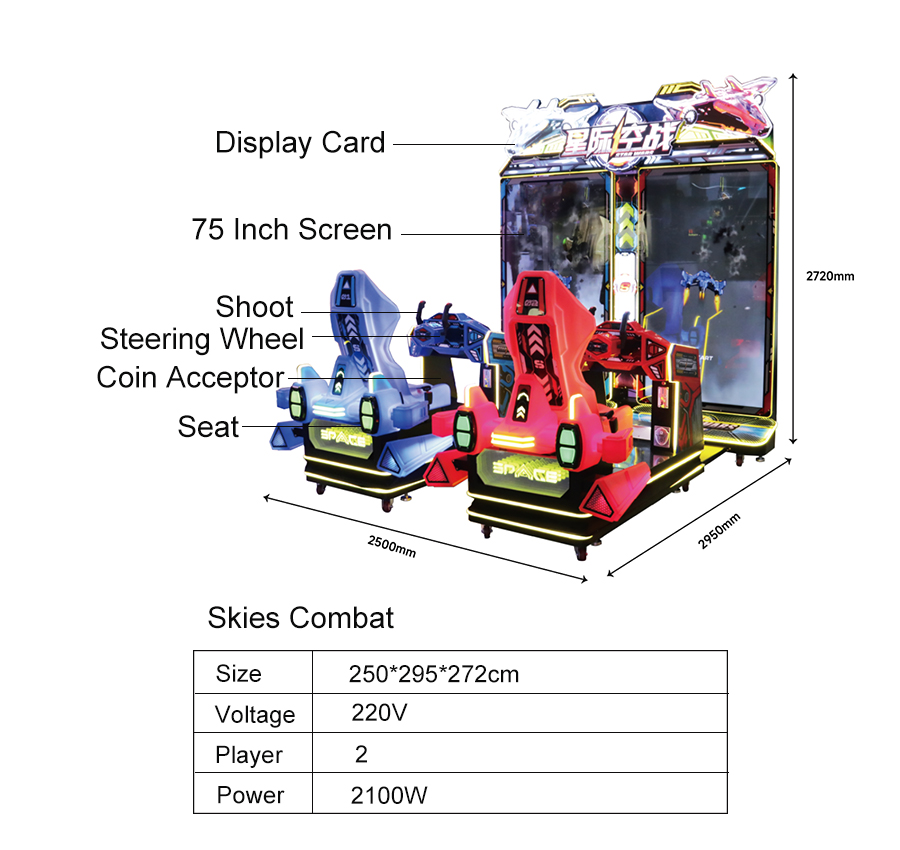 Advantage 1. Top visual experience 75 inch ultra large display brings immersive visual impact Spacious cabin design ensures a comfortable experience for players 2. Powerful performance configuration 2100W high-power output ensures a stunning dynamic effect Large body structure ensures operational stability 3. High space utilization rate Relatively compact design suitable for various site layouts 43 inch screen combined with dynamic system to achieve cost-effectiveness optimization 4. Energy conservation and environmental protection 2000W power balance performance and energy consumption 5 game contents meet the continuous operation needs 5. Advantages The fully dynamic seat system provides a realistic flying experience Two person mode enhances social interaction Multiple scene selection to keep the game fresh