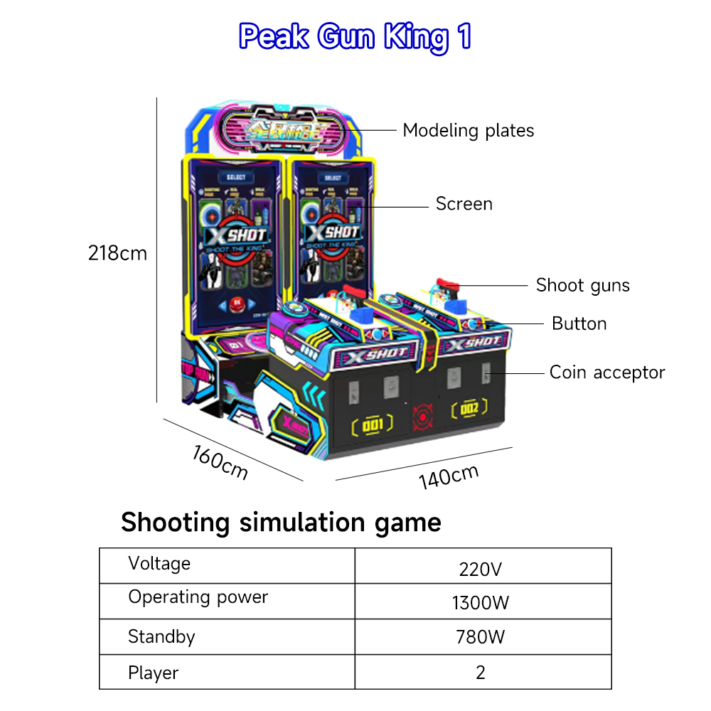 Application scenarios 1. Main scenes: Children's playground, family entertainment center, large supermarket children's area 2. Auxiliary scenes: kindergarten entertainment corner, waiting area for extracurricular training institutions, community activity center 3. Featured scenes: Parent child themed restaurant entertainment area, children's party activity venue Maintenance and upkeep guide 1. Daily maintenance Wipe the dual screens with a dedicated screen cleaner before daily business hours Check the connection status of firearm cables during each shift handover Activate dust cover protection equipment after closing business 2. Periodic maintenance Perform weekly firearm sensitivity calibration Clean the cooling system of the host every month Update game content versions every quarter 3. Precautions Avoid splashing liquid onto the control panel Remind users not to forcefully pull or tug on firearm cables Suggest configuring a voltage regulator to ensure stable operation 4. Emergency response Execute a three-level restart process in case of sudden system crash Timely backup player data records Keep our technical support hotline