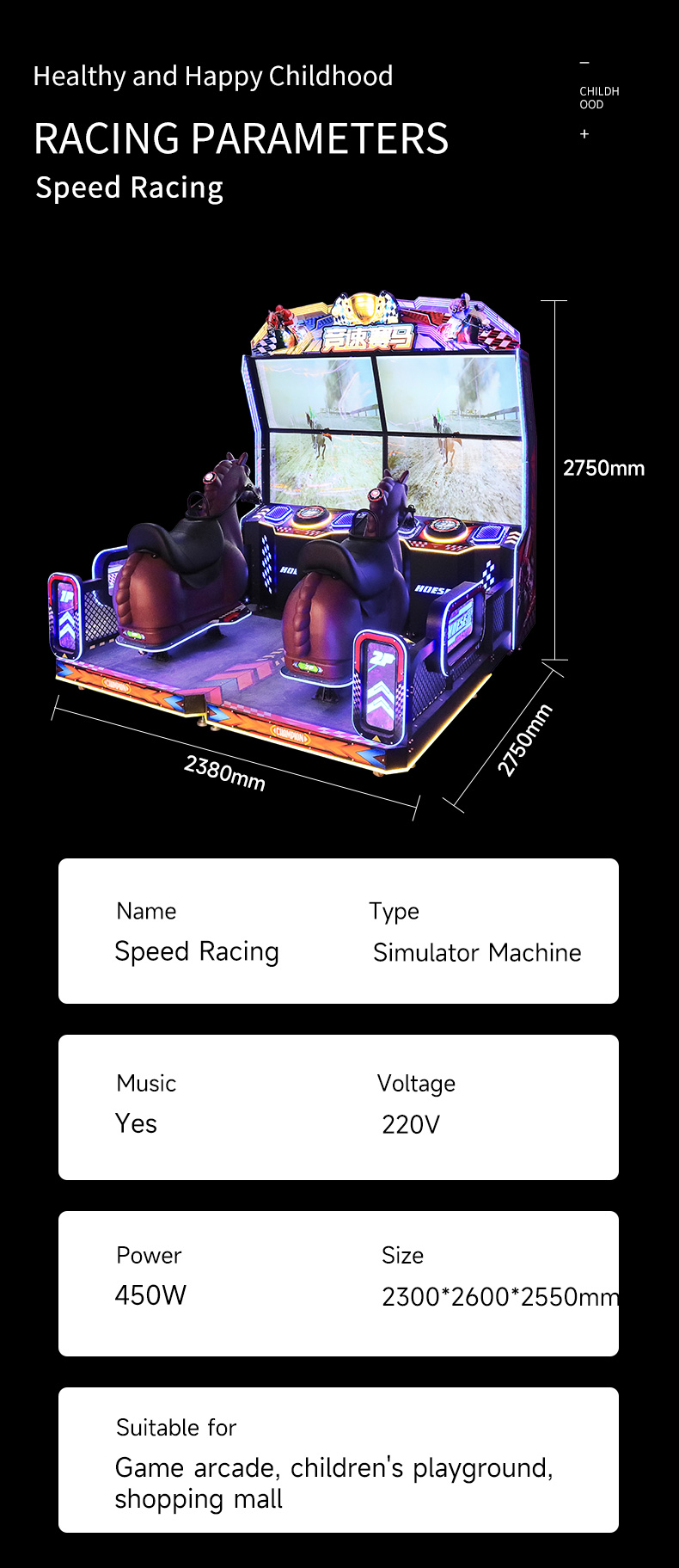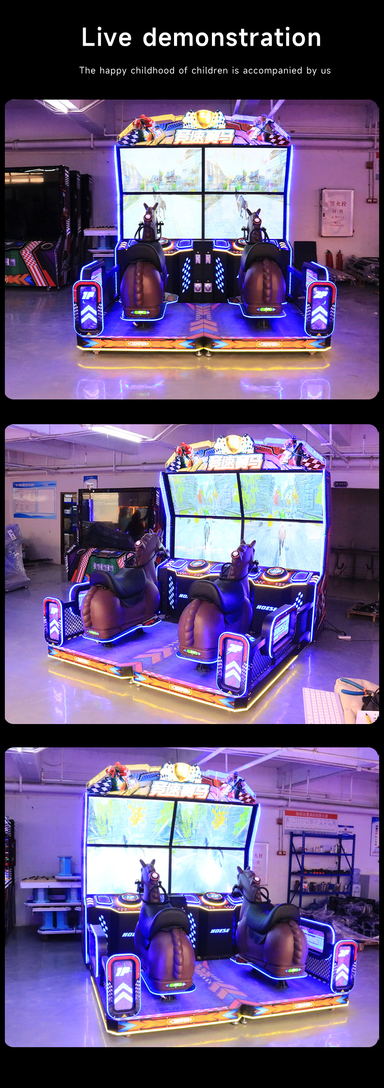 Performance-wise, this coin-operated system delivers consistent response latency and competitive game balancing necessary for multiplayer horse racing gameplay. User ergonomics are enhanced via the dedicated horse-riding seat and intuitive control interfaces optimized for quick onboarding and sustained engagement. The machine’s compatibility with an extensive platform ecosystem supports frequent content updates and feature expansions, improving lifecycle value and customer retention for operators. Combined, these performance characteristics provide venues with a sustained revenue source and user satisfaction edge over traditional single-player or less immersive entertainment options.